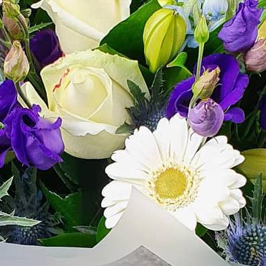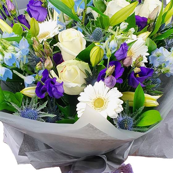 A gentle mixed flower bouquet featuring cream roses, white gerberas, blue delphinium, purple lisianthus, closed lily buds and textured thistle, arranged with fresh green foliage for a calm, elegant finish. please note this is the supreme bouquet in the picture.