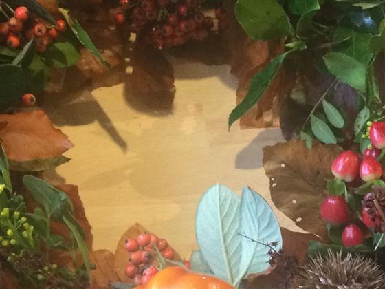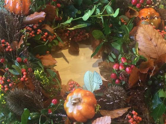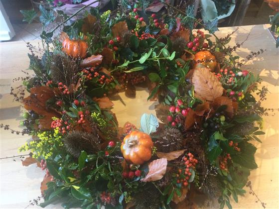 This autumn wreath is a large mixed foliage and berries with various other