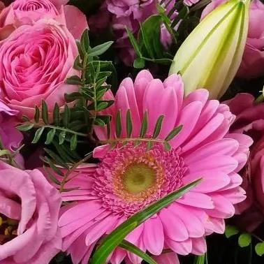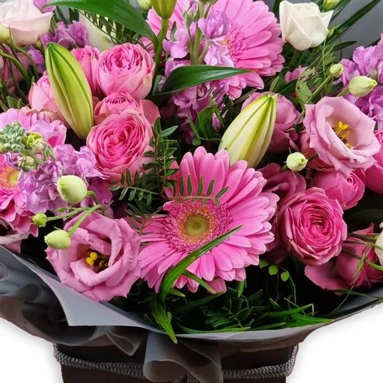 A graceful bouquet in shades of pink, combining pale lisianthus, blush rose sprays, soft gerberas and tender lilies, with cerise stock accents and feathery foliage, beautifully arranged in a chic box for a gentle touch.