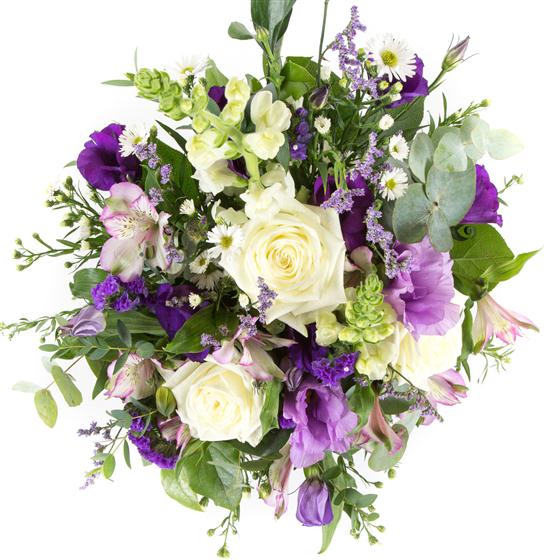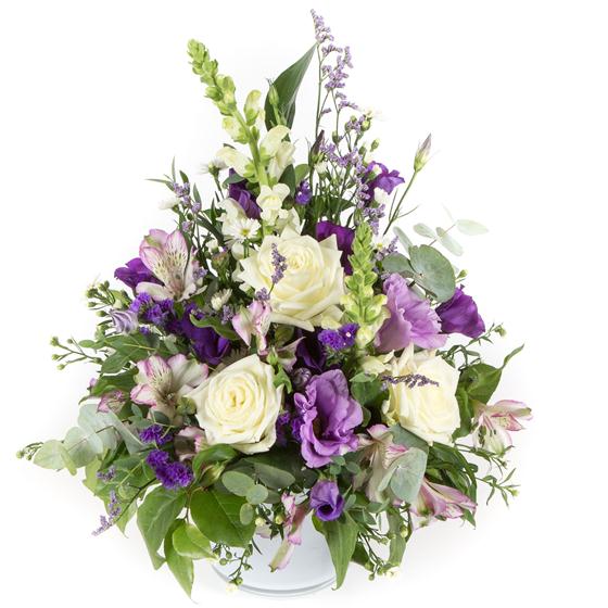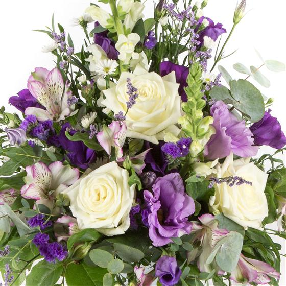 A sweet arrangement in shades of whites, creams and lilacs and purples including roses, September flower, lisianthus and alstromeria.
