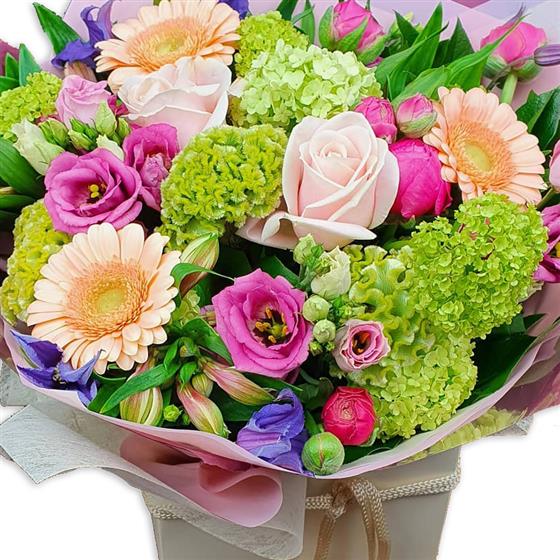 Delicate peach gerberas, pastel roses and lime hydrangea balls cluster alongside magenta lisianthus, lavender freesia and verdant leaves, wrapped in blush paper for whisper-soft elegance.