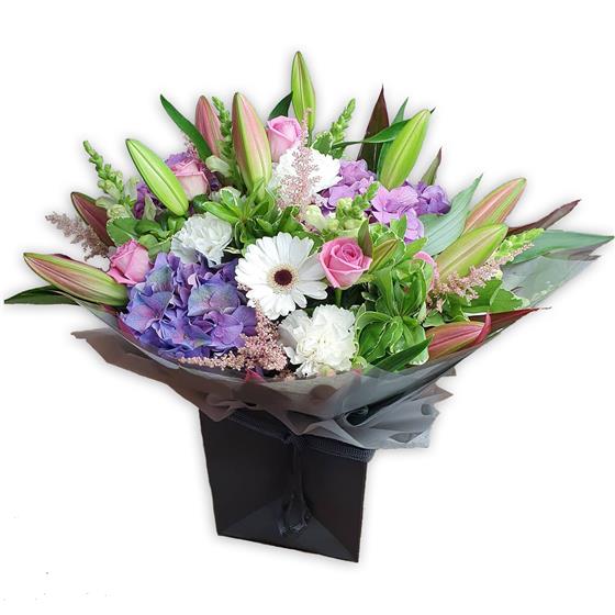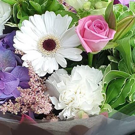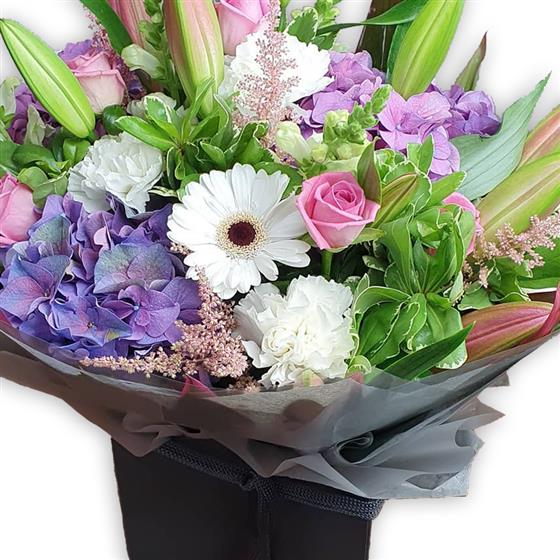 A serene arrangement of violet hydrangea, blush spray roses and creamy carnations, accented by pink astilbe and elegant lilies, all wrapped in delicate paper for a whisper-soft finish.