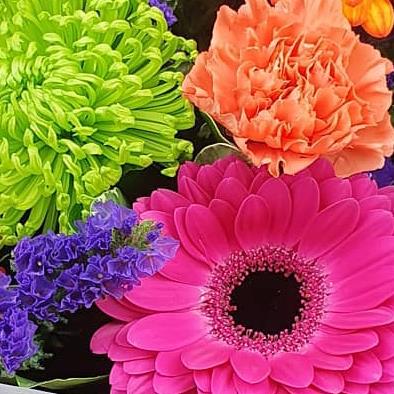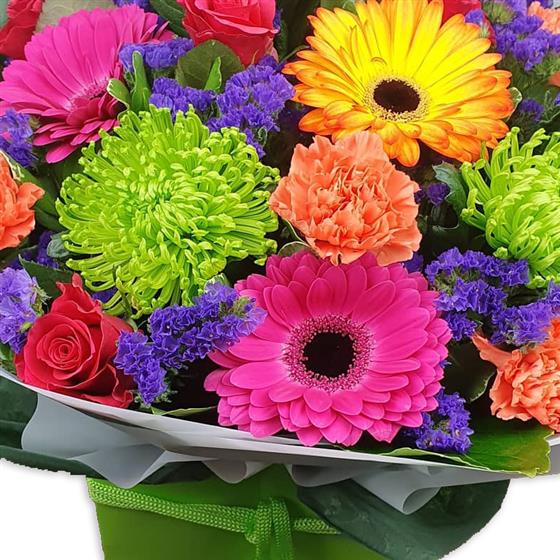 Design includes bright pink and orange gerbera, red roses, peach carnations, green chrysanthemum blooms, purple statice and glossy green foliage, arranged into a bold, cheerful bouquet bursting with colour, texture and playful energy.
