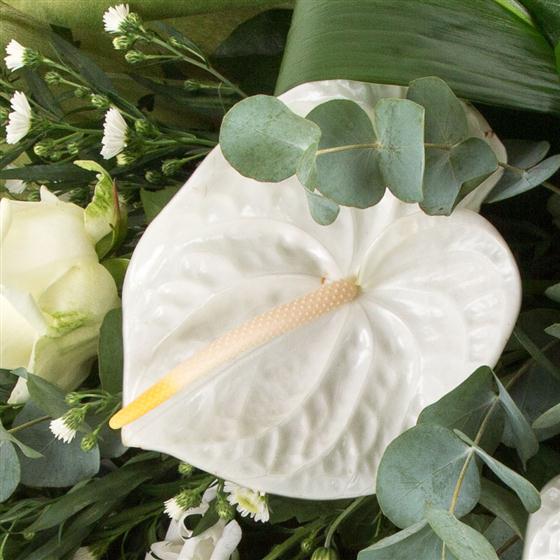 A simple combination of cream and white blooms and unusual greens. Anthuriums, lilies and roses are included in this modern style sheaf.