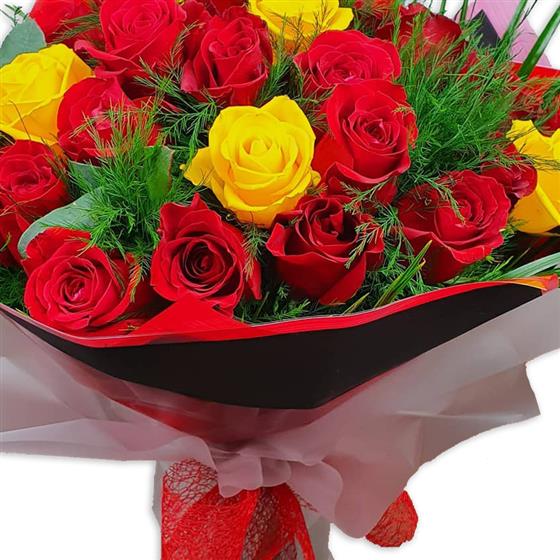 Design includes classic red and vibrant yellow roses arranged with soft ferny foliage and fresh green accents, creating a bold, eye-catching bouquet full of warmth, contrast and strong colour impact.
