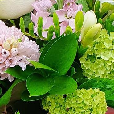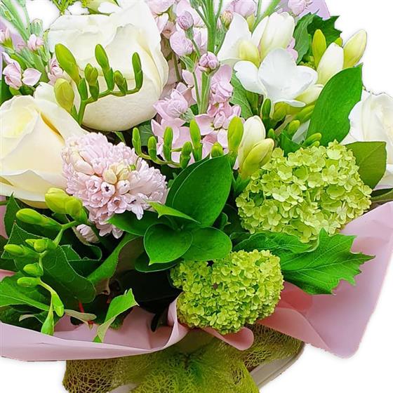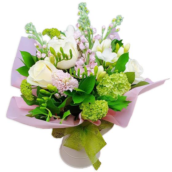 A fresh, airy bouquet designed with white roses, freesias, pale stocks, green viburnum, soft pink blooms and seasonal foliage, arranged to give gentle height, texture and a calm, modern floral finish.