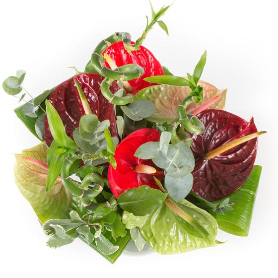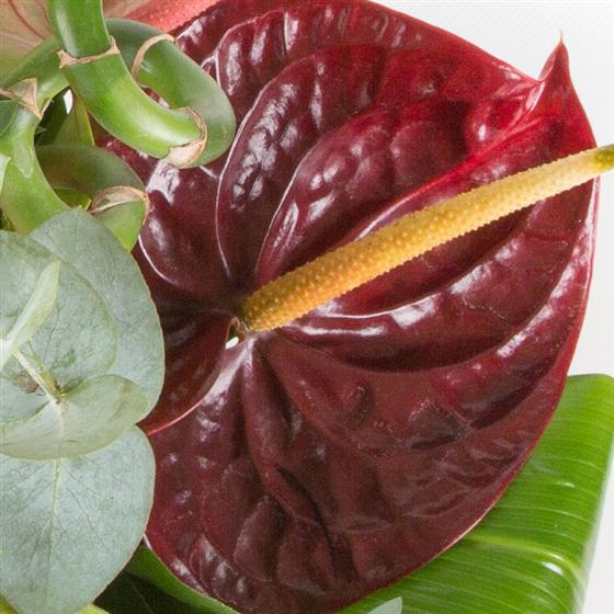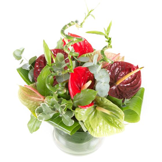 An extra special gift of long lasting mixed anthuriums, bamboo and foliage presented in a glass bowl.