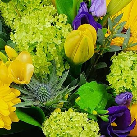 Delicate yellow tulips and Asiatic lilies pair with golden gerberas, chartreuse viburnum, blue eryngium and purple lisianthus for a subtle, radiant gift.