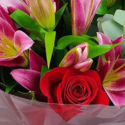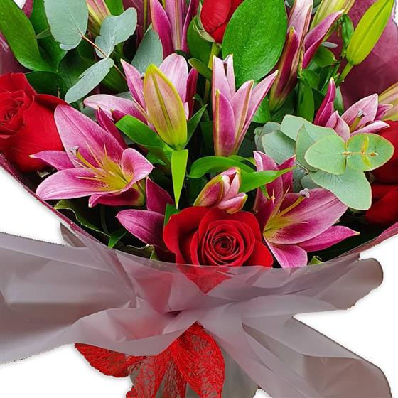 Design includes pink oriental lilies at various stages of bloom, classic red roses, eucalyptus foliage and fresh green leaves, brought together in a striking bouquet that balances bold colour with soft texture and natural movement.