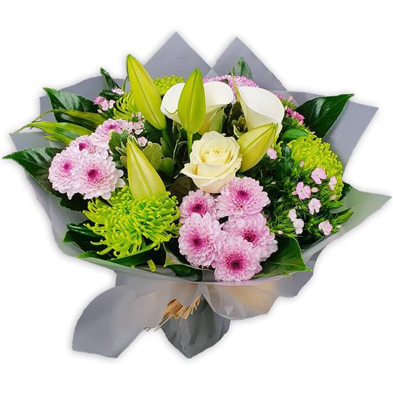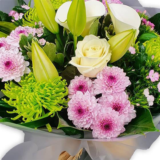 Delicate calla lilies, creamy garden roses and pastel pink daisies blend with lime spider mums and tender lilies, wrapped in verdant leaves for understated, poetic elegance.