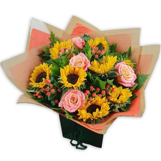 Sunny sunflower blooms, pastel pink roses and coral hypericum berries nestled in verdant foliage create a softly vibrant bouquet that whispers warm morning light.