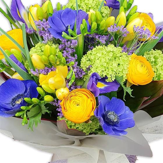 Design includes yellow ranunculus-style blooms, blue anemone-style flowers, viburnum, freesia buds, soft purple seasonal detail and fresh foliage, arranged into a lively spring bouquet with movement, texture and clean colour contrast.