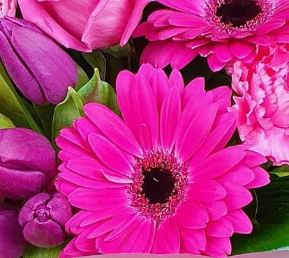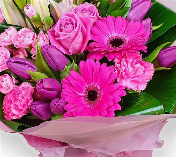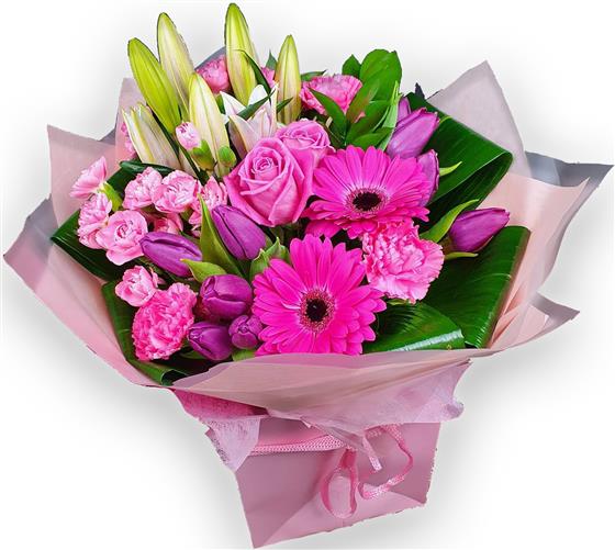 Design includes roses, gerbera daisies, tulips, carnations, unopened lily buds and glossy green foliage, arranged into a full, rounded bouquet with rich pink tones, gentle texture and a fresh, elegant finish.