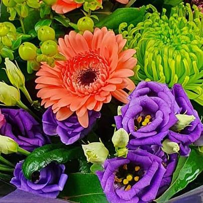A bold mixed flower arrangement featuring roses, gerbera, lisianthus, chrysanthemums, hypericum berries and seasonal foliage. Strong colour contrasts and varied textures combine to create a lively, modern design with real visual impact.