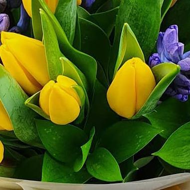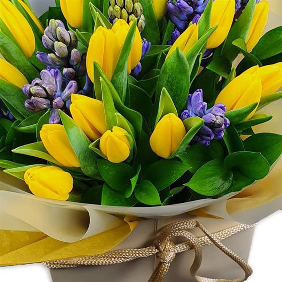 Design includes yellow tulips and hyacinth-style blooms with fresh green foliage, arranged into a crisp, uplifting bouquet that celebrates simple spring colour, clean lines and natural freshness.