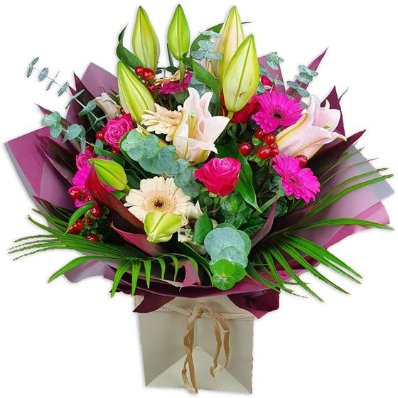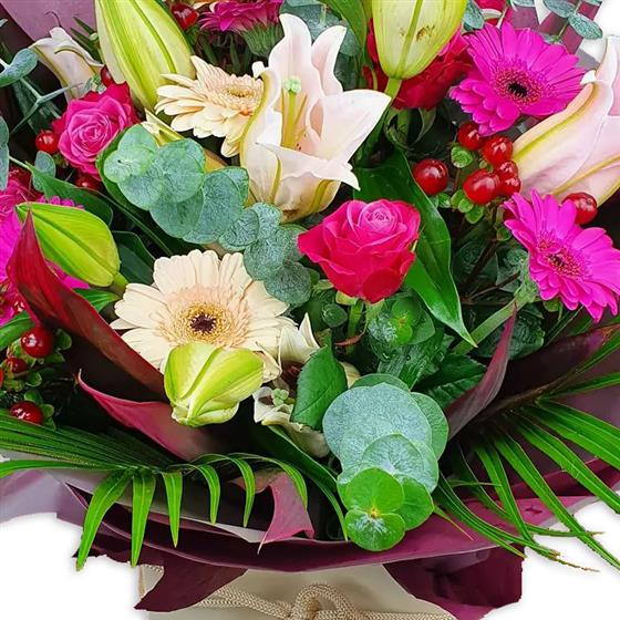 Design includes unopened and opening oriental lily buds, pale pink lilies, bright pink and cream gerbera, pink roses, red hypericum berries, eucalyptus stems and mixed green foliage, arranged into a structured bouquet with height, contrast and contemporary style.