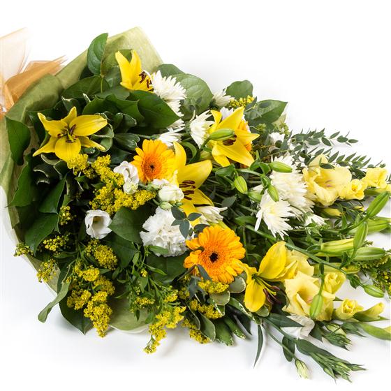 An open sheaf of seasonal gold and white blooms, incorporating lilies, mini gerberas & lisianthus.