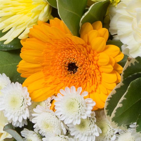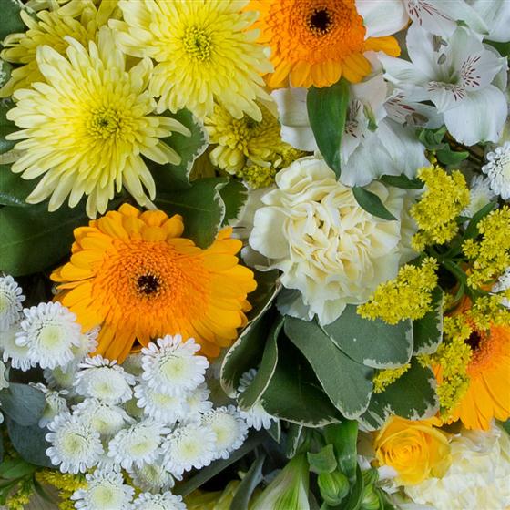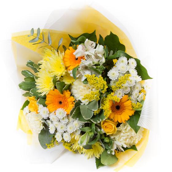 A simple hand-tied bunch of gold and white blooms including gerberas, chrysanthemums, carnations and alstromeria.