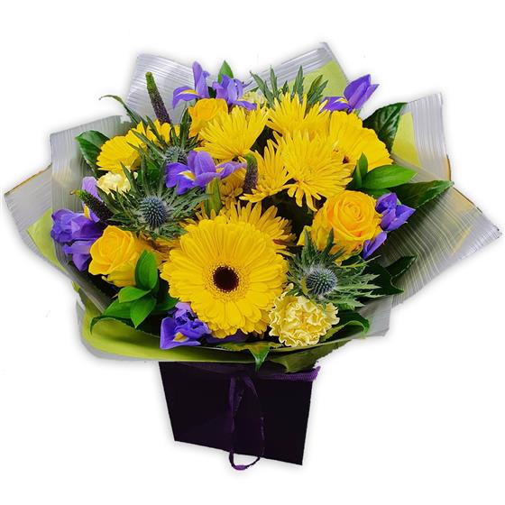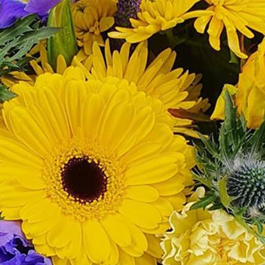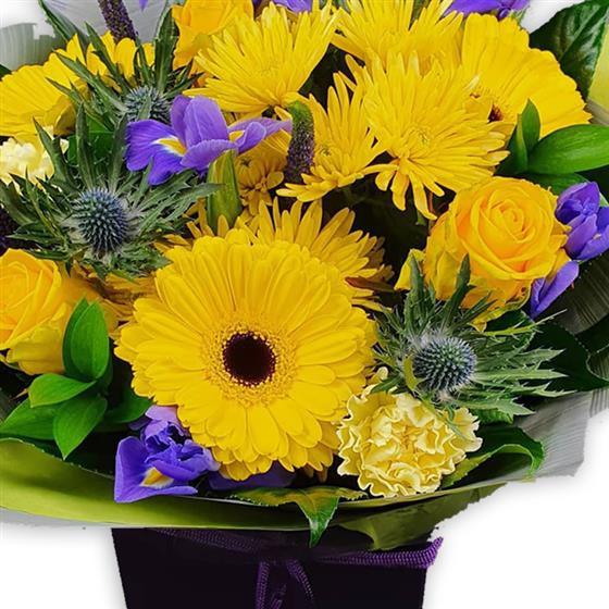 Bright yellow gerbera daisies, buttery spider mums and rosebuds mingle with violet iris, steely thistles and lush foliage evoking soft sunlit joy.