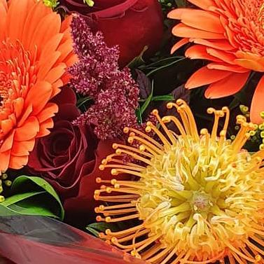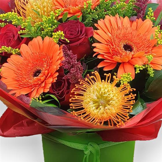 Design includes vibrant orange gerbera, rich red roses, striking pincushion protea, textural seasonal fillers, fresh green accents and glossy foliage, arranged into a lively bouquet packed with warmth, contrast and eye-catching, feel-good colour.