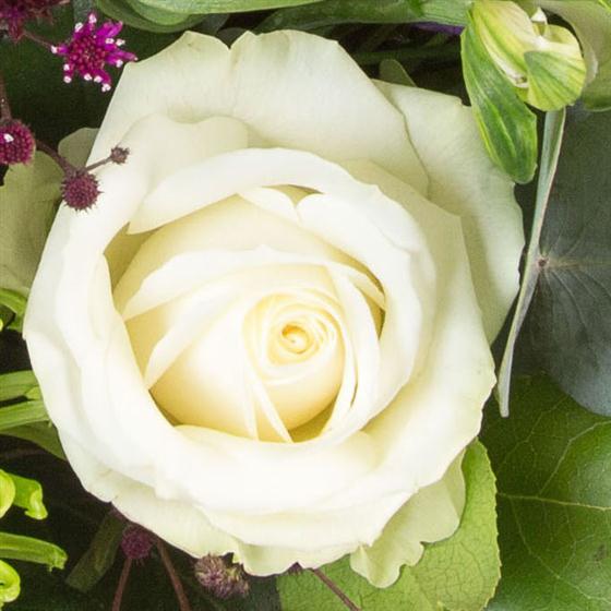 This hand-tied bouquet in shades of purple, and lime accented with white roses and alstromeria is a joy to receive.