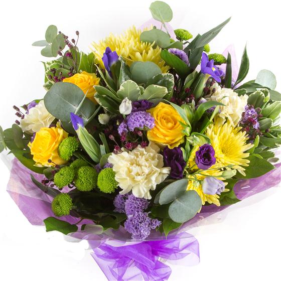 Glorious purples, yellows and limes including roses, lisianthus and thistles combine together to create a striking hand-tied bouquet.