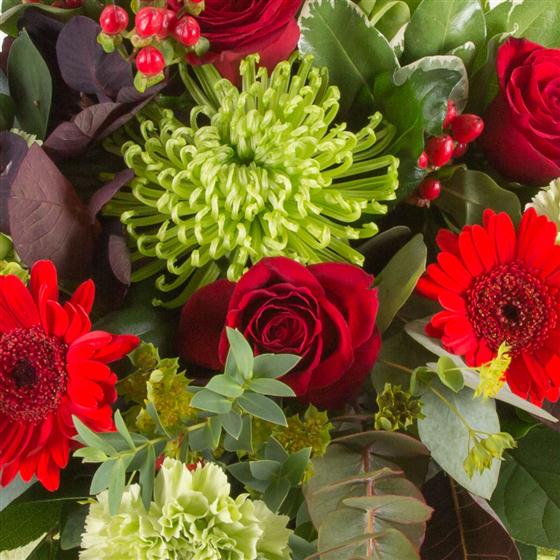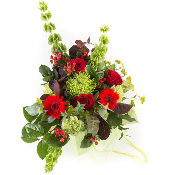 An unusual, vibrant gift bag of limes and reds, including molucella, shamrock bloom, roses and eucalyptus.