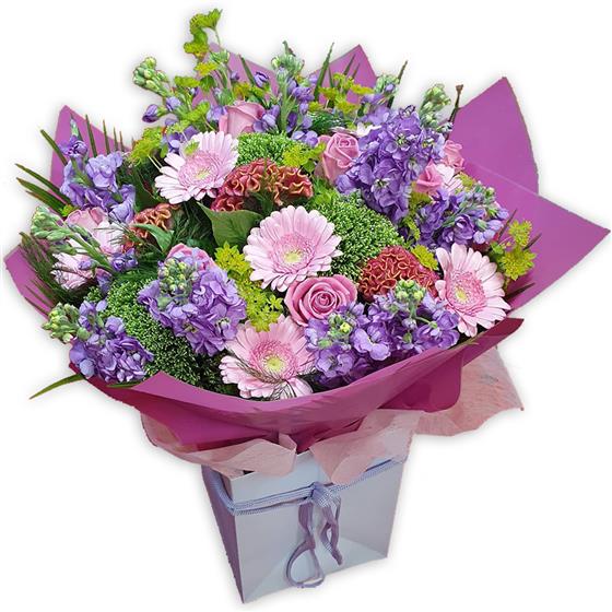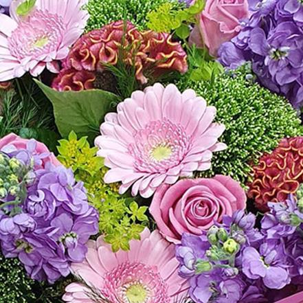 Soft pastel roses and pink gerberas are paired with lavender stock, lime viburnum balls and coral cockscomb, nestled in fresh greenery for an airy, gentle flourish.