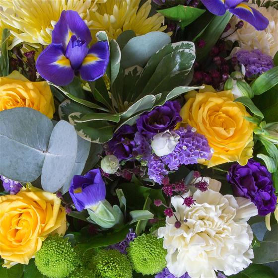 Glorious purples, yellows and limes including roses, lisianthus and thistles combine together to create a striking hand-tied bouquet.