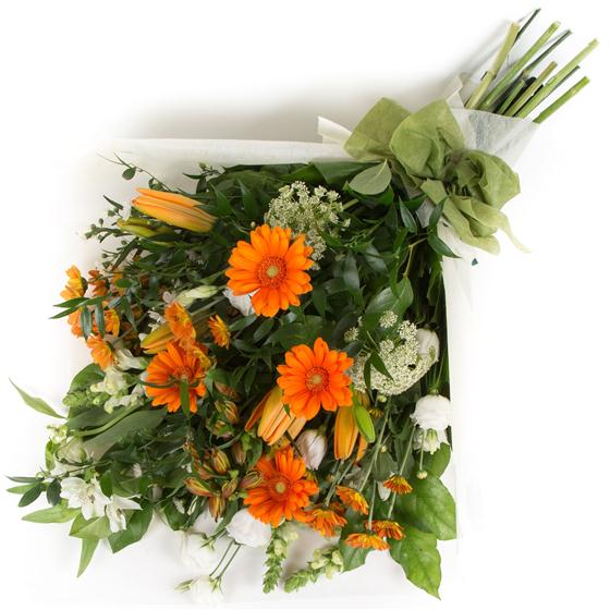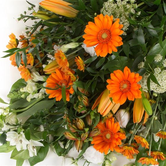 A vibrant selection of orange and white blooms including mini gerberas and lilies.