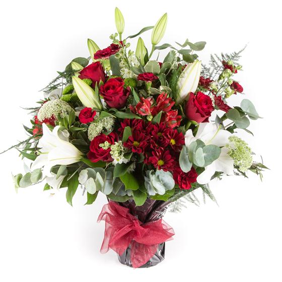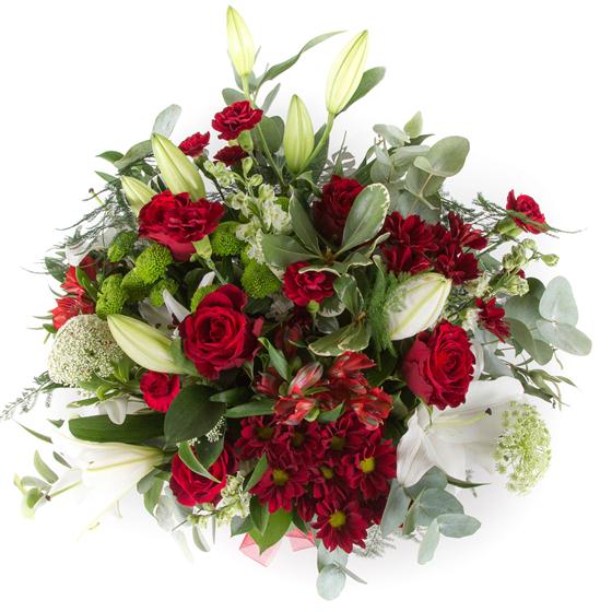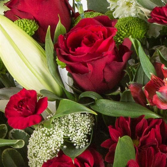 An exotic collection including red roses, oriental lilies with a variety of red and lime blooms and foliage.