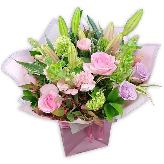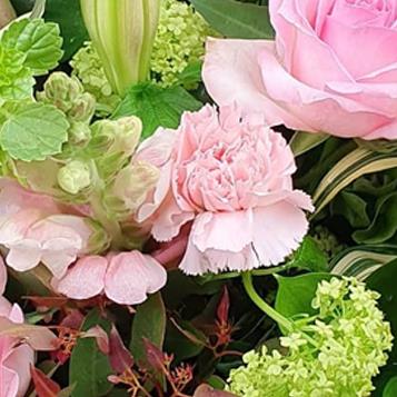 A pastel garden including lilies, blush roses, pale pink carnations, lilac spray roses and chartreuse bells of Ireland woven with variegated dracaena and eucalyptus for whisper-soft spring elegance.