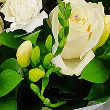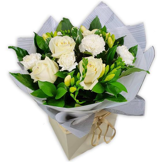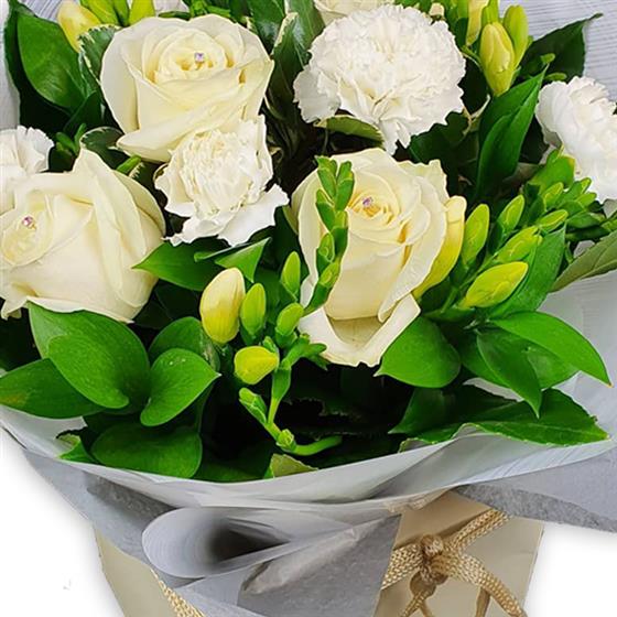 Creamy ivory roses, delicate white carnations and pale freesia blooms entwine with glossy leaves in a minimalistic wrap for understated, timeless beauty.