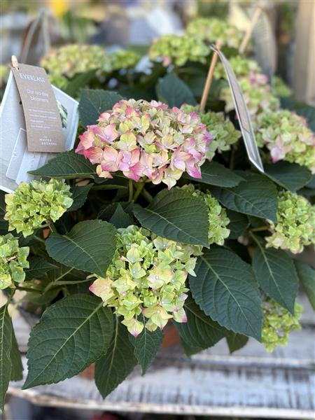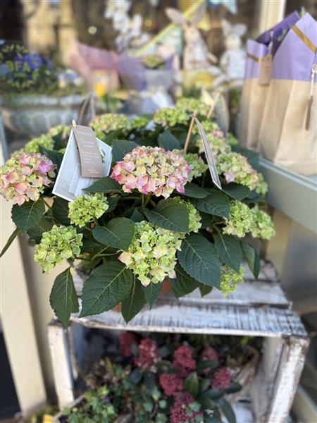Pink hydrangea in a gingham gift box