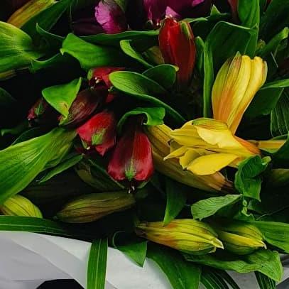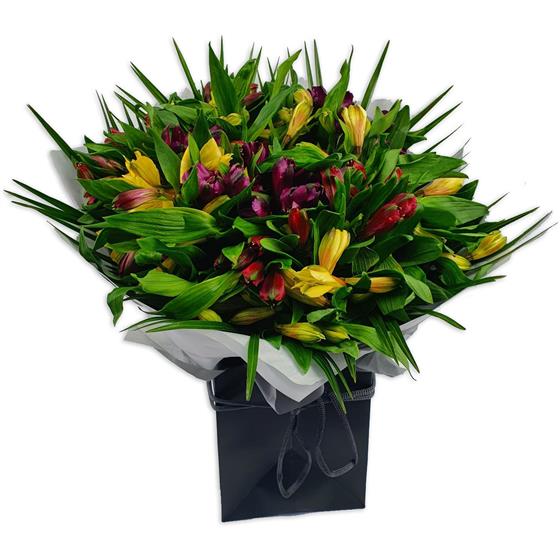 A contemporary flower arrangement featuring alstroemeria blooms in rich seasonal tones, designed with abundant fresh foliage for shape and movement. Clean, modern and textural, this design focuses on natural form and understated colour contrast.