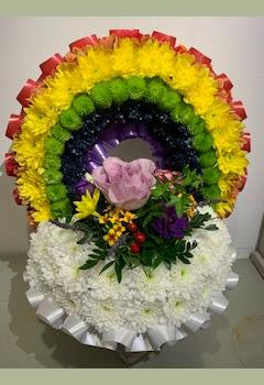 This special rainbow 3 D design is approximately 10 inch in width and a 15 inch in height. It sits on a basic with the colours of the rainbow.