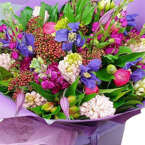 A lush, garden-style hand-tied bouquet featuring stocks, ranunculus, clematis, alstroemeria, spray roses, viburnum and seasonal foliage, layered with varied textures, vibrant colour contrasts and a natural, freshly gathered feel throughout.