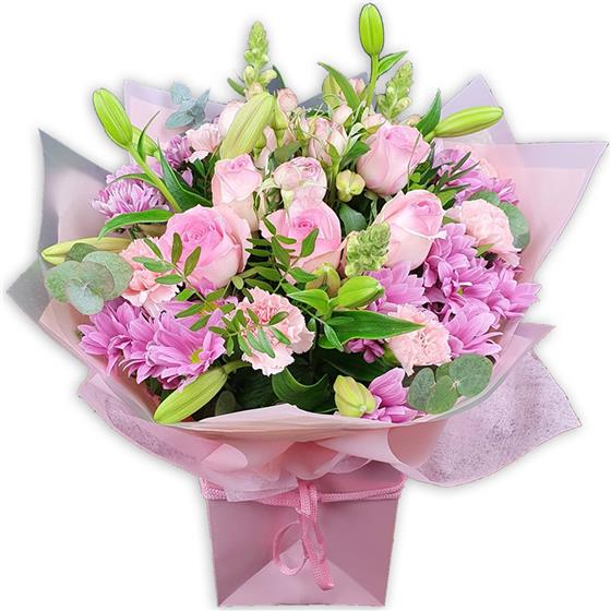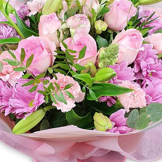 Whisper-light lilies and pink snapdragons rise above blush roses, dainty carnations and gentle chrysanthemums, tied together with eucalyptus and lush greenery for a dreamy, poetic bouquet.