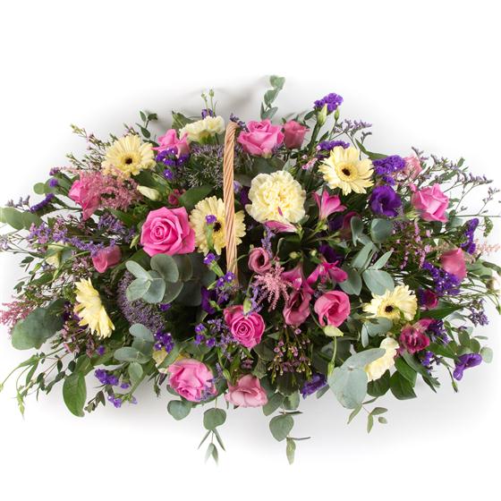 A large, natural style basket arrangement of dainty flowers in pretty summer shades of lemon, lilac, pink and purple.