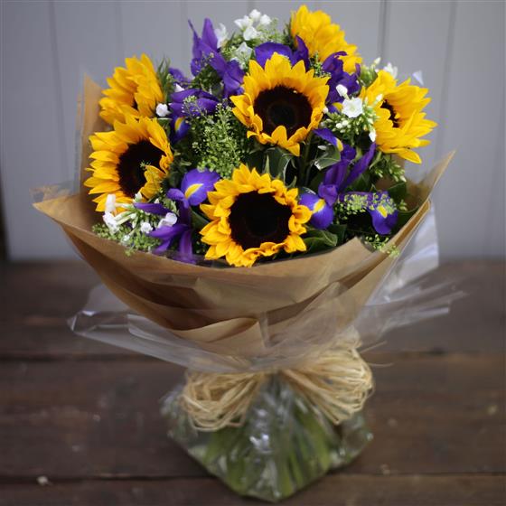 A striking hand tied bouquet of Sunflowers, Iris and Green Bells.