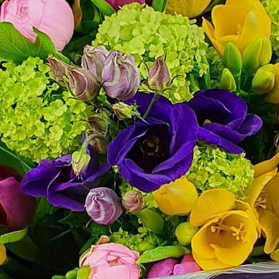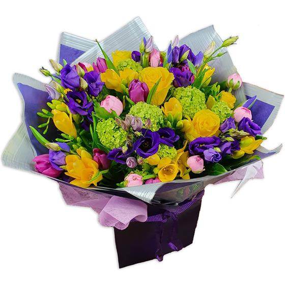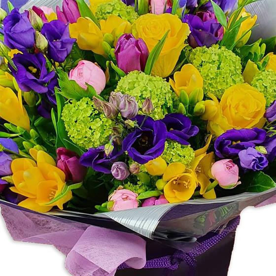 A bold, high-impact hand-tied bouquet featuring yellow roses, yellow freesias, pink tulips, purple lisianthus, green viburnum and mixed seasonal foliage, creating a lively blend of texture, contrast and confident colour throughout.