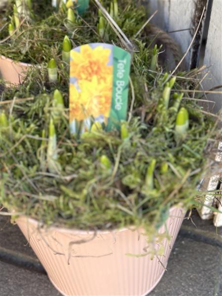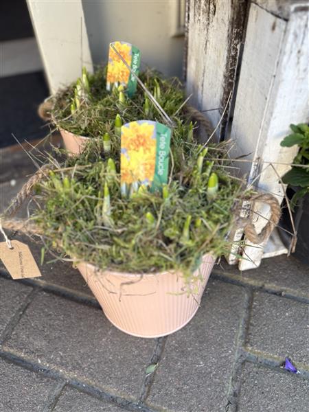 Tete a tete in a peach zinc bucket with chocolates  zoom 2Tete a tete in a peach zinc bucket with chocolates  zoom 3