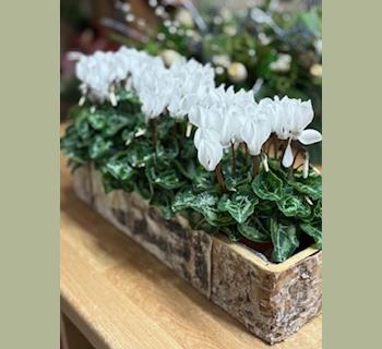 This beautiful set of trio white Cyclamen in a log trug also in red cyclamen available