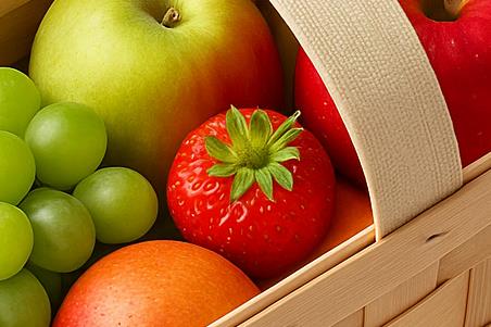 The mixed basket contains a mixture of seasonal fruits, along with the usual apples, bananas, pears, oranges and grapes.
